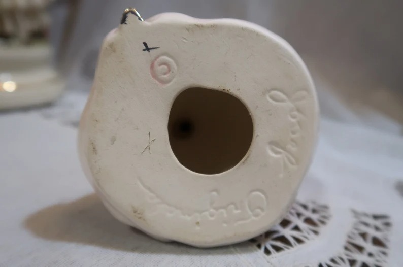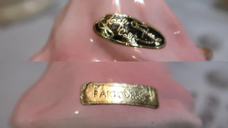 Body Condition: Excellent vintage condition. No cracks or chips of note. Typical age crazing is present (see photos). One blue rhinestone on the dress has been replaced with a vintage style rhinestone (see photos). The foil stickers are in fair condition (see photos). Lovely color and shiny gloss finish.